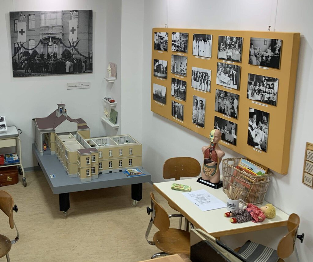 So sah es früher im Krankenzimmer aus: das Bettzeug sollte akkurat zurechtgezupft sein, wie zur Chefarzt-Visite. Man kann nachempfinden, wie dieser Raum ausgestattet war, sich ins letzte Jahrhundert zurückversetzen. Im Mittelpunkt befindet sich der Patient im Krankenbett. Persönliche Utensilien und die entsprechende Einrichtung, Behandlungs- und Pflegehilfsmittel dürfen nicht fehlen. Medizinische und pflegerische Prozeduren werden dargestellt, z. B. Infusionen und Anwendungen.