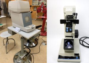 unter Anleitung optische Geräte wie ein ein Auto-Refraktometer zur Messung der Sehschärfe (li.) und ein Lensmeter zur Feststellung der Brillenstärke (re.) ausprobieren.
